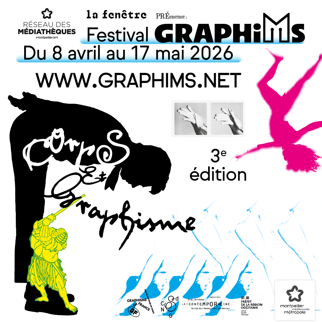 GraphiMs 08.04.2026 17.05.2026 Dans 5 médiathèques de la Métropole de Montpellier et à La fenêtre Corps et Graphisme Le corps proteste, manifeste, résiste, il structure l’expérience. Il est à la fois sujet, outil et mesure, et se place au cœur de toute communication visuelle, de toute perception, de toute émotion… GraphiMs